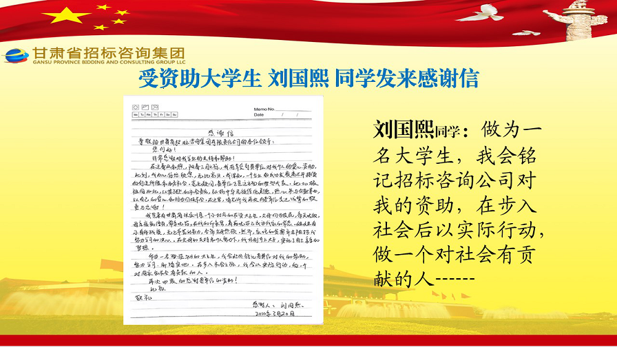 近日,張家川縣張棉驛鄉(xiāng)張棉村貧困大學(xué)生代表劉國熙、周長斌、李雪峰等向甘肅省招標咨詢集團有限責任公司發(fā)來感謝信,就招標咨詢集團給予學(xué)費資助一事表達他們的感激之情。