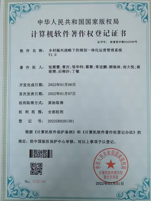 近日,從國家版權局傳來好消息,甘肅省建筑設計研究院有限公司自主研發的“鄉村振興戰略下的規劃一體化運營管理系統V1.0”,獲得國家版權局頒發的計算機軟件著作權登記證書。